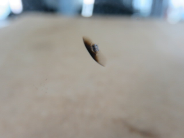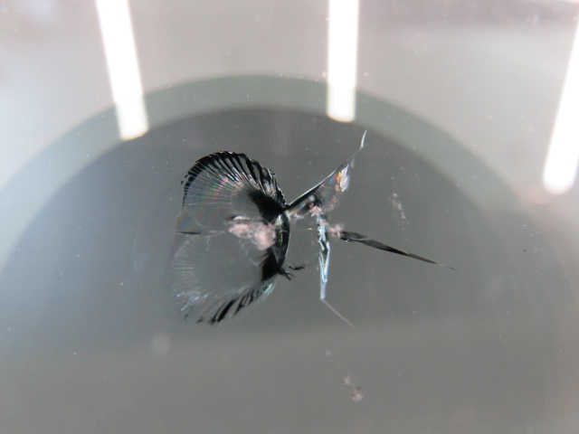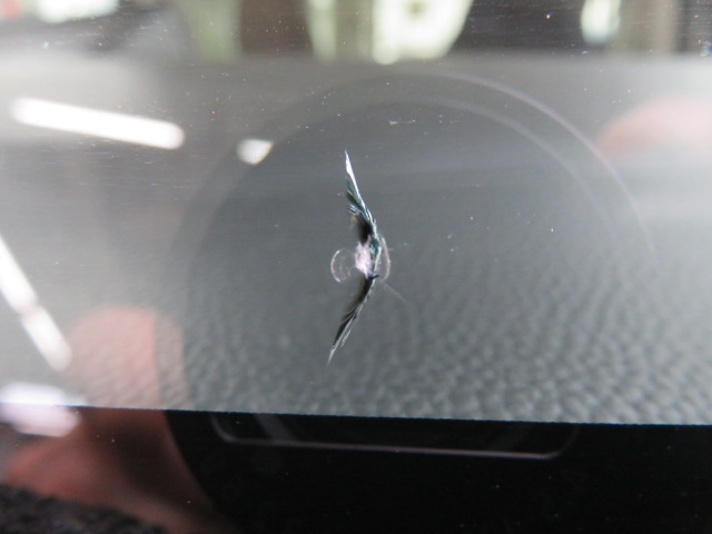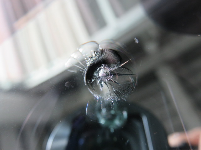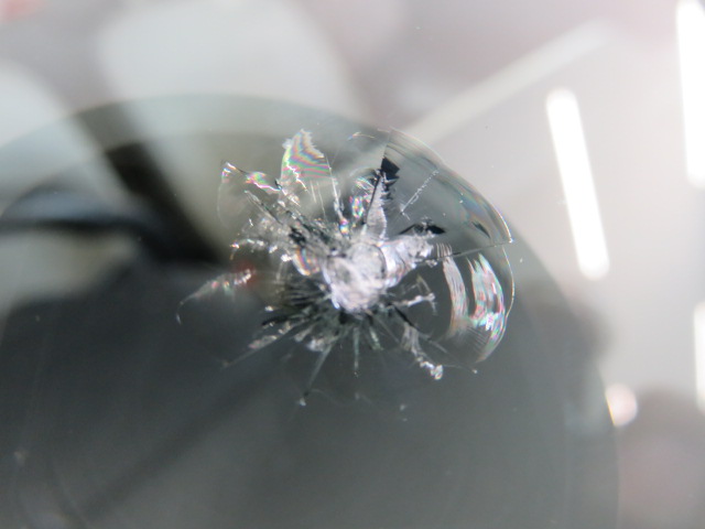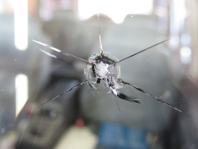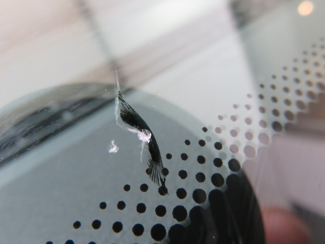 ちょうど500円玉サイズ? 今日は金沢市内にある自動車修理工場にフロントガラス修理に行って来ました。 車検にてガラス修理のようで、よくこんな状態で放って置きましたね。 車検でチェックが入るので早目に修理しましょう。