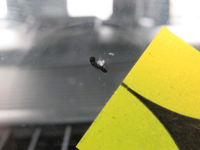 Sディーラー様より 石川県羽咋市 今日は石川県羽咋市にあるSディーラーさんにガラス修理に行って来ました。画像が2枚あるのは同じガラスに2カ所あるからです。昨日からの天気で雨が傷に入り、少し透明に見えます。このまま修理することはなく、しっかり水分除去してから修理します。